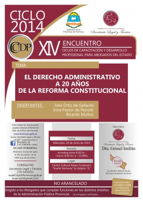 HORARIO: 8 a 12 Hs.El Derecho Administrativo a 20 años de la Reforma Constitucional. Temas: *Dra Inés Ortíz: "La Reforma de la Constitución Nacional de 1994 y su influencia en el Procedimiento Administrativo." *Dra. Irma Pastor: "El Reclamo Administrativo Previo y el Derecho de Defensa". *Dr. Ricardo Muñoz: "El impacto de la Reforma Constitucional sobre el Procedimiento Administrativo". |