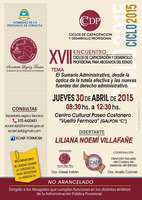 En este encuentro se abordara el tema: "El Sumario Administrativo", desde la óptica de la tutela efectiva y las nuevas fuentes del Derecho Administrativo. Disertante: Dra. Liliana Noemí Villafañe
