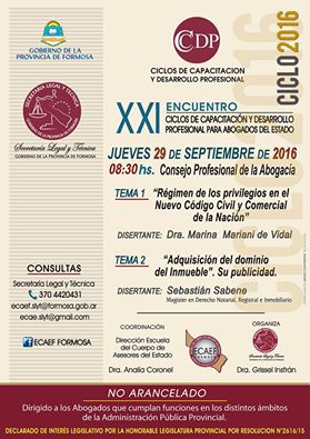 Los temas a tratar serán "REGIMEN DE LOS PRIVILEGIOS EN EL NUEVO CODIGO CIVIL Y COMERCIAL DE LA NACIÓN" y "ADQUISICIÓN DEL DOMINIO DEL INMUEBLE. SU PUBLICIDAD", desarrollados por los reconocidos disertantes Dra. Marina Mariani de Vidal y Sebastián Sabene, Magíster en Derecho Notarial, Registral e Inmobiliario.