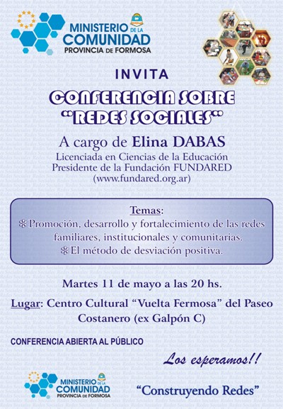 El Ministerio de la Comunidad invita al público en general a la Conferencia sobre "Redes Sociales" que será dictado por la Lic. Elina Dabas.