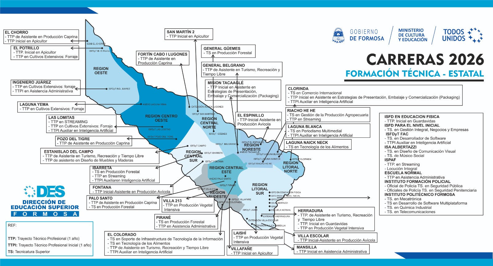La Formación Técnica, en 2005 comienza su implementación a gran escala en la provincia (ofertas en su mayoría del ámbito productivo, en respuesta a la política de desarrollo de la provincia). A partir de 2007, se han incorporado en mayor escala tecnicaturas sociales y humanísticas. Ya existían desde comienzo de los ?90 carreras de Educación Superior Técnica, pero en 2005 a raíz del cierre de la formación docente, la formación técnica cobra más relevancia y aumenta considerablemente el número de ofertas.
