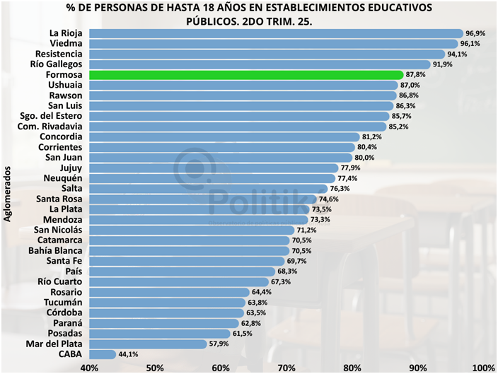 En cuanto al aglomerado de Formosa, desde la consultora Politiké reflejaron que el porcentaje de alumnos que asistieron a un establecimiento público fue del 87,8%. De esta forma Formosa, se mantiene entre los primeros lugares a nivel país como el aglomerado que mayoritariamente cuenta con estudiantes en instituciones públicas.