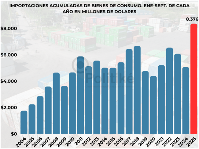 De acuerdo a los datos suministrados por el Centro de Economía Política Argentina (CEPA), en septiembre de 2025, las importaciones de bienes de consumo alcanzaron USD 1157 millones, marcando el tercer mes consecutivo de máximos históricos, precisaron y agregaron que en el acumulado enero-septiembre, totalizaron USD 8376 millones, el valor más alto desde el inicio de la serie en 2004 y USD 1693 millones por encima del récord previo de 2018, lo que implica un crecimiento del 25,3%.